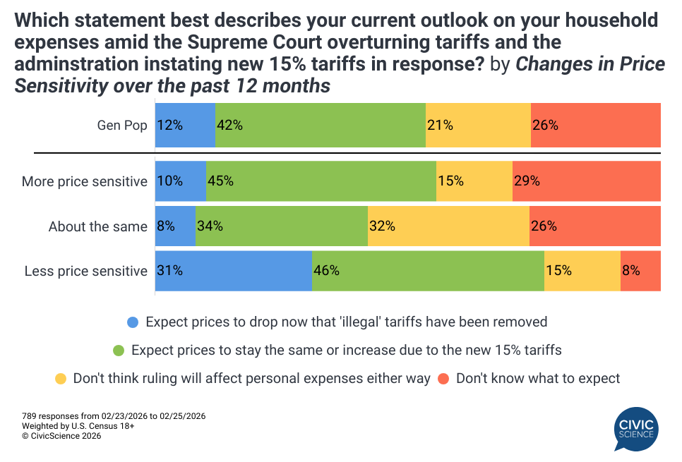 Respondents who have become less price sensitive over the last 12 months are nearly three times as likely as the average American to expect prices to go down as a result of the ruling. This contrast suggests that while more affluent or less budget-constrained Americans may be focusing on the legal victory, the consumers most vulnerable to price changes remain stuck in a “wait-and-see” pattern regarding the real-world impact on their finances.