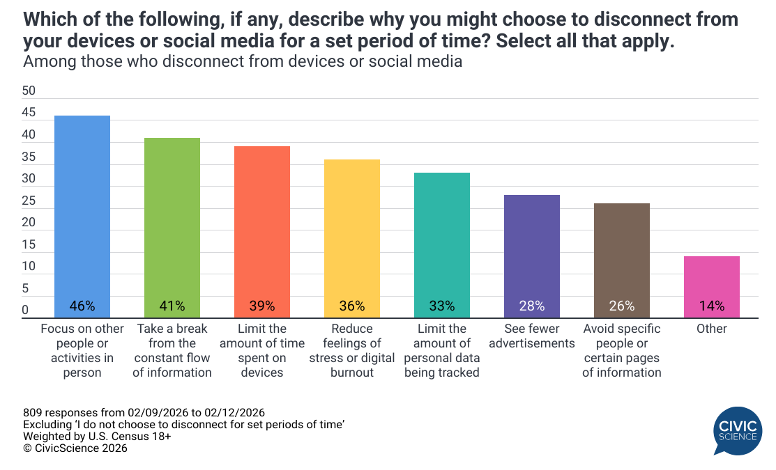 As national well-being declines, 78% of Americans are now intentionally disconnecting from social media and devices to protect their emotional health. According to new CivicScience data, the primary motivator is a desire for in-person connection and activities. Meanwhile, about two in five adults say they unplug to escape information overload and digital burnout. Advertising fatigue and avoiding specific people or pages, meanwhile, are less common drivers of this digital detoxing.