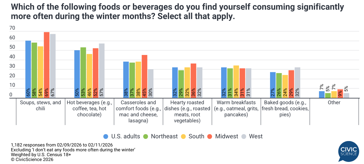 When examining winter-specific preferences, a clear divide emerges based on geography. While soups, stews, and chili (60%) lead as the most popular cold-weather category, the Midwest emerges as the epicenter for traditional winter “comfort” categories like casseroles and roasts, whereas Western consumers lean toward indulgence via hot beverages and baked goods (among those who alter diets during the winter). Notably, Southerners are the least likely to change their eating habits, likely because of their more temperate winter climates.