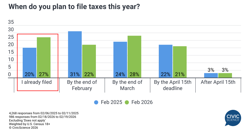 With tax season nearly a month underway, new CivicScience data reveals there’s been an early-season surge in the percentage of those who say they have already filed, compared to February of last year. More than one-quarter say they’ve already filed their taxes, seven points ahead of last year’s pace (excluding ‘does not apply’).
