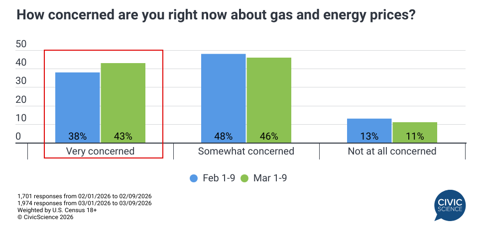 Public concern mirrors this high level of engagement, with 81% of Americans feeling at least ‘somewhat’ concerned about the conflict. This anxiety is increasingly tied to the pump as 43% of the Gen Pop now reports being ‘very’ concerned about gas and energy prices – a five-point jump from this time last month. This financial worry is even more pronounced among those closely tracking the Middle East conflict, where ‘very concerned’ levels climb to 50%.