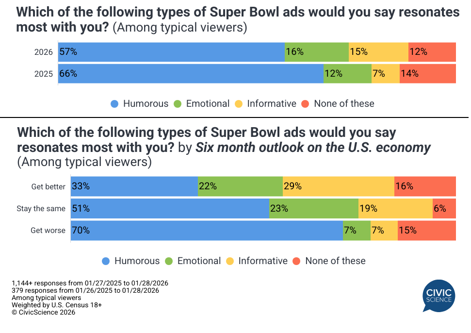 Speaking of Super Bowl advertising, humorous ads continue to resonate most with typical viewers, though their appeal has dropped by nearly 10 points since last year. In contrast, emotional (+4 points) and informative (+8 points) ads have gained traction this year, particularly among those who feel optimistic about the future of the economy. Meanwhile, viewers who believe the economy will worsen in the next six months are far more likely to say that humorous Super Bowl ads resonate most with them.