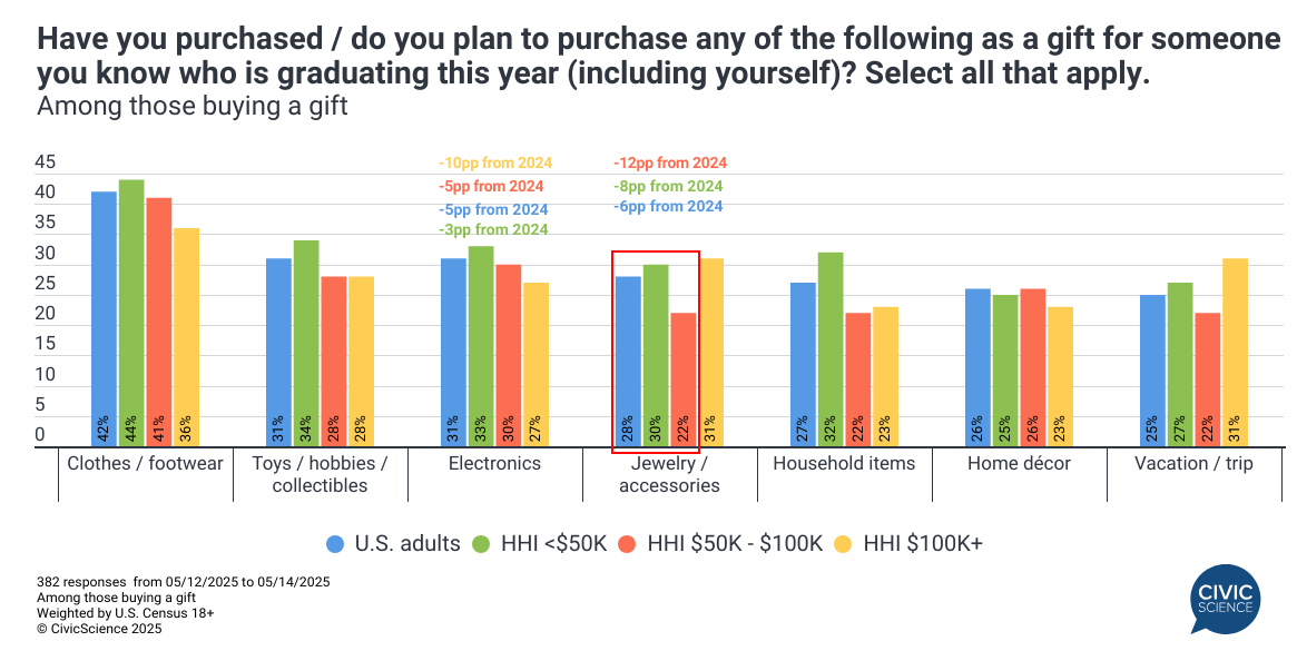 This year, over one in three Americans say they plan to attend a graduation ceremony — and their gift-giving habits are evolving. As tariff concerns weigh heavily, electronics have declined in popularity across all age groups compared to last year, with a notable 10-point drop among higher-income households. Fewer lower-income shoppers are gifting jewelry, instead favoring clothes and home goods. Lower-income Americans are also six percentage points more likely to give a vacation or trip than last year.