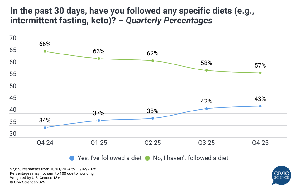Real-time CivicScience survey data reveal that dieting is becoming a more common behavior among U.S. adults. More than two in five Americans now say they’ve followed a diet recently, up from just over one-third in Q4 of last year. The prevalence of dieting increases significantly among consumers who dine out frequently, most notably led by those who regularly do so at upscale restaurants.