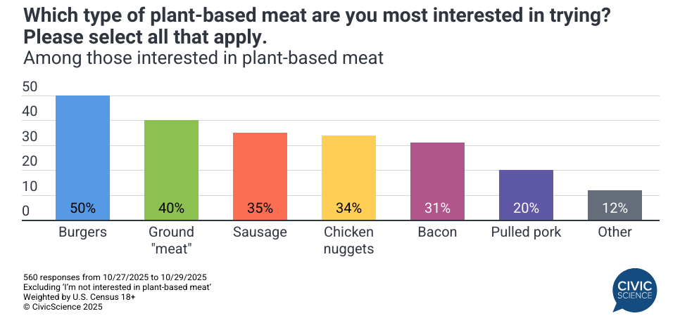 Among those interested in plant-based meat alternatives, burgers, ground “meat,” sausage, and chicken nuggets generate the highest levels of consumer interest, suggesting that familiarity and product versatility continue to drive demand in this category.