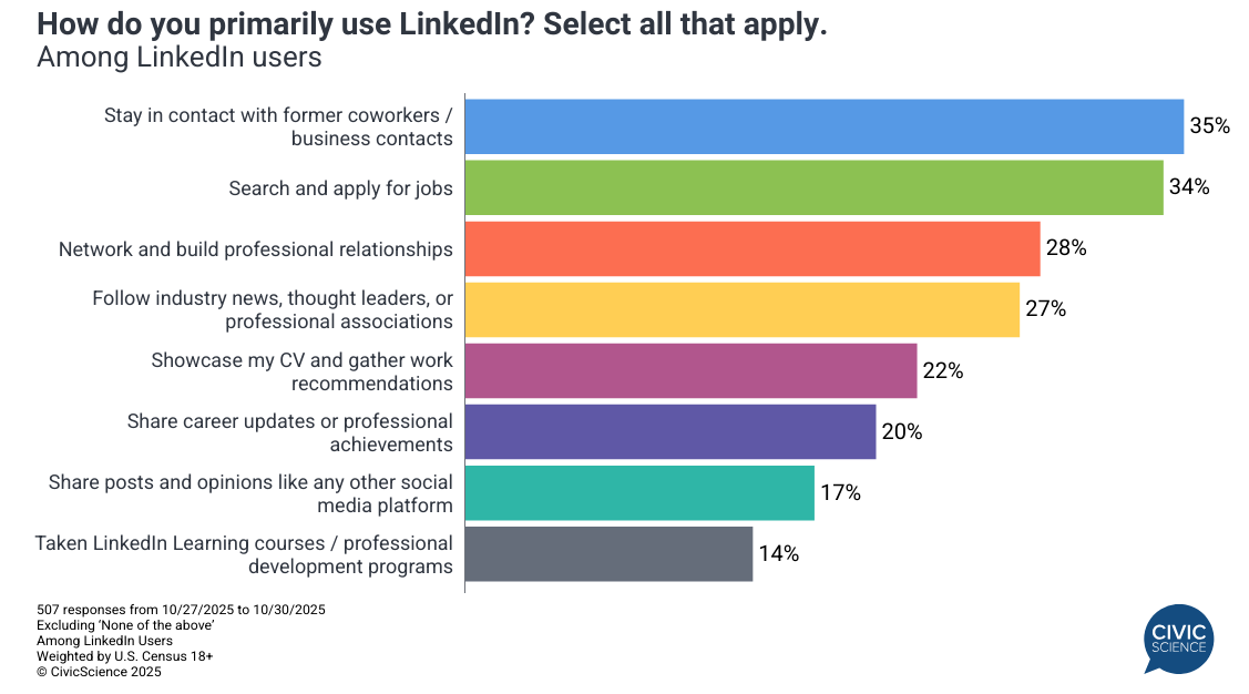 A recent wave of layoffs across major companies nationwide is sparking uncertainty about what’s next for American workers. This week, CivicScience examined the digital hub of professional life on LinkedIn to see how people are using the platform and whether they feel that it’s paying off. More than one-third of users primarily use LinkedIn to stay in touch with former coworkers and business contacts, while a similar percentage use it to search for and apply for jobs.