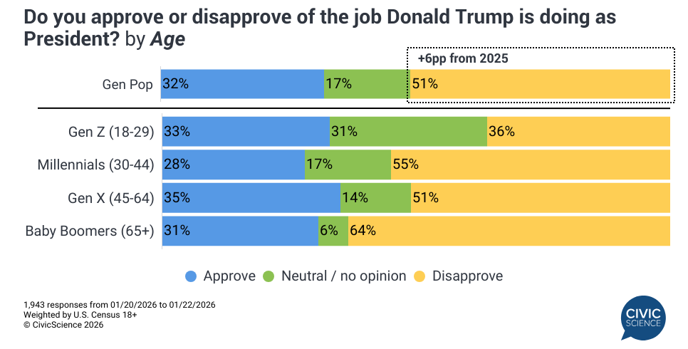 CivicScience data also reveal a distinct demographic divide in how Americans feel about the job President Trump is doing: the administration’s support is most concentrated among Gen Z, aged 18-29, and individuals with a high school diploma or less, suggesting an appeal to younger and non-college-educated voters. Conversely, opposition is strongest among Baby Boomers 65+ and those with graduate degrees, highlighting a stark generational and educational rift in the national perception of his presidency.