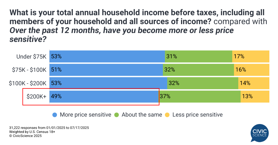 Economic volatility continues to shape consumer behavior in 2025, with new CivicScience data showing heightened price sensitivity across all income levels over the past 12 months. Higher-income households are far from immune, as data also reveal 49% of households earning $200K+ report becoming ‘more’ price sensitive over the past 12 months—just below the rates seen in lower-income groups—while only 13% say they’ve become ‘less’ sensitive. Even the most financially secure consumers appear to be pulling back.