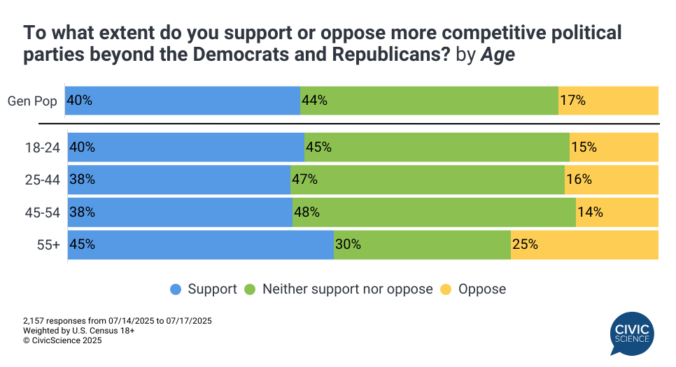 After Elon Musk expressed a desire to form a new political party, CivicScience asked Americans how they feel about third-party options overall. The results show a clear appetite for alternatives: 40% of adults favor expanding beyond the two-party system, compared to 17% who oppose. But opinions come with nuance—Americans 55+ are the most likely to support a more competitive political party landscape. However, they’re also the age group with the strongest opposition.