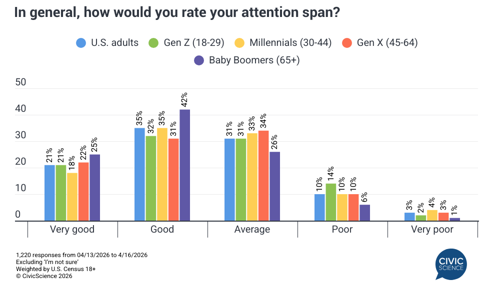 The topic of attention spans has become increasingly relevant across industries, influencing how people engage with content in various formats. New CivicScience data show most Americans rate their attention spans positively, with 56% describing theirs as ‘very’ good or ‘good,’ while about a third say ‘average’ and 13% report theirs as ‘poor’ or ‘very’ poor. Generationally, baby boomers (65+) are more likely to report above-average attention spans, whereas Gen Z adults are most likely to say theirs is ‘poor.’ Millennials are the most likely to say ‘very poor’ and the least likely to report ‘average,’ while Gen X most often lands in the middle.
