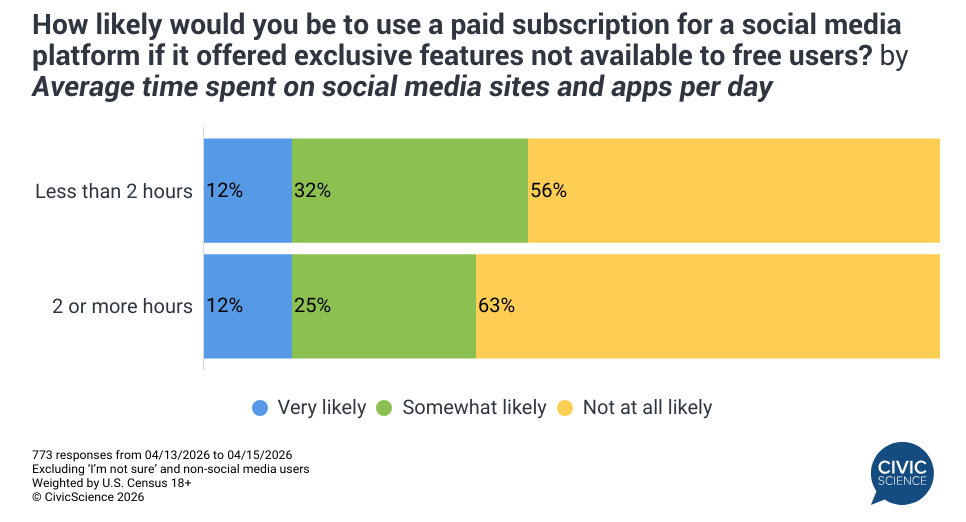 As social media platforms experiment with premium tiers, 36% of U.S. adults say they would be at least ‘somewhat’ likely to use a paid subscription if it offered exclusive features not available to free users, including 11% who are ‘very’ likely (excluding those unsure). As expected, younger Americans are most receptive to premium social media subscriptions, with nearly two-thirds (63%) of Gen Z respondents saying they would be likely to opt into a paid model, compared to 26% among Gen X and just 8% among those 65+.