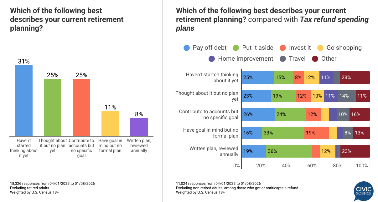 Notably, this lack of planning discipline bleeds directly into immediate behavior; individuals who have taken no action on retirement are significantly less likely to save their tax refund and more likely to use it for debt or immediate spending. This suggests that the absence of a long-term roadmap leaves the majority of consumers in a cycle of reactive, short-term financial management.