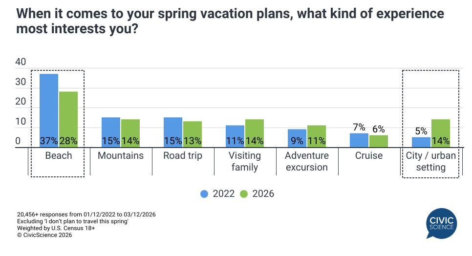 As spring travel kicks into high gear, CivicScience data show that just over one quarter (27%) of travelers have their plans fully booked. That’s up seven percentage points from last month, but it indicates that a substantial share of travelers are still in the decision-making phase. And when it comes to the type of vacation these spring travelers are considering, beach vacations remain the most popular option. However, interest in those vacations has declined nearly 10 points over the past four years. Instead, interest in urban-centered vacations has nearly tripled, while interest in visiting family and adventure excursions has also increased for spring 2026.
