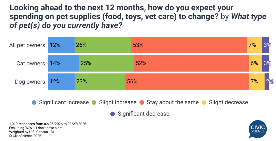 New consumer-reported data finds that about 17% of U.S. adults are planning to get a dog in the next 12 months, while 11% are planning to get a cat, and an equal share (5%) is likely to get a fish or another type of pet. The pet industry is showing remarkable staying power in consumer spending, despite an economy of persistent uncertainty. Additional CivicScience data show a net spending intent of +28%, with 38% of owners planning to spend more on their pets this year compared to only 10% who plan to cut back. Cat owners are leading this charge as they are four percentage points more likely than dog owners to increase their budget for supplies and care.