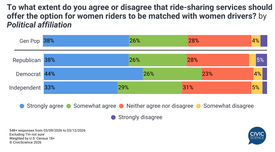 Uber recently rolled out its Women Preference feature nationwide, allowing women riders to book rides with women drivers. New CivicScience survey data shows that roughly two-thirds of Americans agree that ride-sharing services should offer women the option to request a female driver (excluding those unsure). While this sentiment is expectedly strongest among women, the majority of men are also supportive, and the consensus spans political lines.