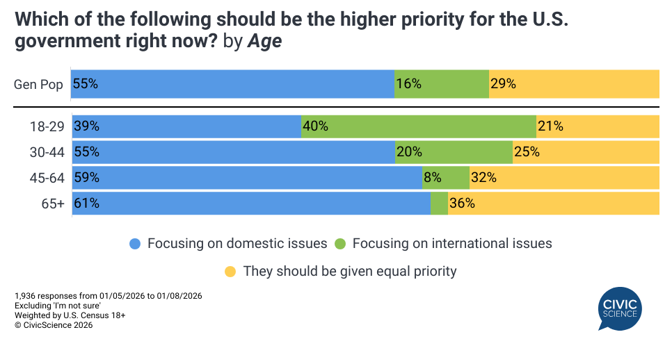 New CivicScience survey data find that 55% of U.S. adult respondents believe the federal government should prioritize domestic challenges—such as healthcare and the economy—over international action to protect national security or regional stability (excluding those who are unsure). This preference for inward-looking policies is most pronounced among those aged 65+ and Democrats, who prioritize addressing high costs of living and infrastructure issues at home. The data also reveal a noteworthy divide among Republicans, with 41% saying domestic and international issues should be given equal priority, and 40% who would prefer challenges at home be the government’s higher priority.