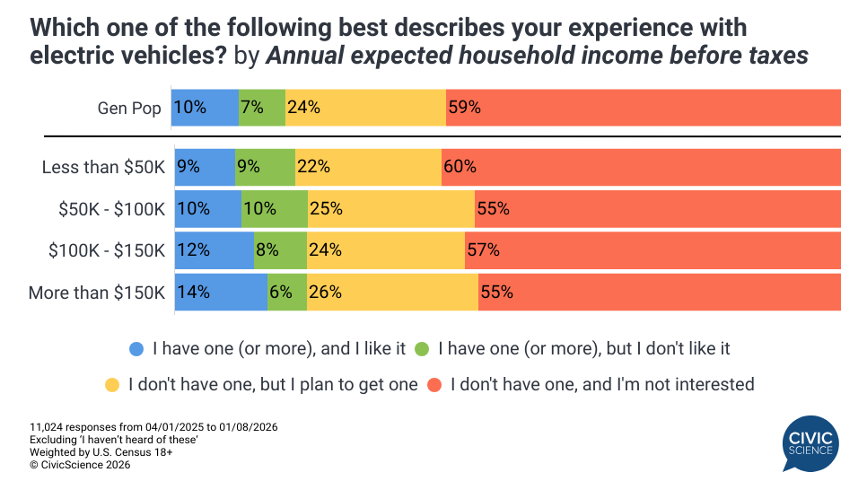 Ford’s recent decision to scale back its all-electric vehicle strategy reflects broader challenges facing the EV market, including softer-than-expected demand, high production costs, and shifting regulatory priorities. According to CivicScience survey data, 59% of U.S. adults who are familiar with EVs say they do not own or have any interest in owning one, signaling adoption resistance despite years of market expansion. Unsurprisingly, this resistance is heavily stratified by economic status; adoption remains concentrated in higher-income households, where consumers are not only more likely to purchase these vehicles but also report higher satisfaction levels. Consequently, the transition to electric appears to be stalling as it hits a “luxury ceiling,” making it difficult for manufacturers to reach the broader middle-market demographic.