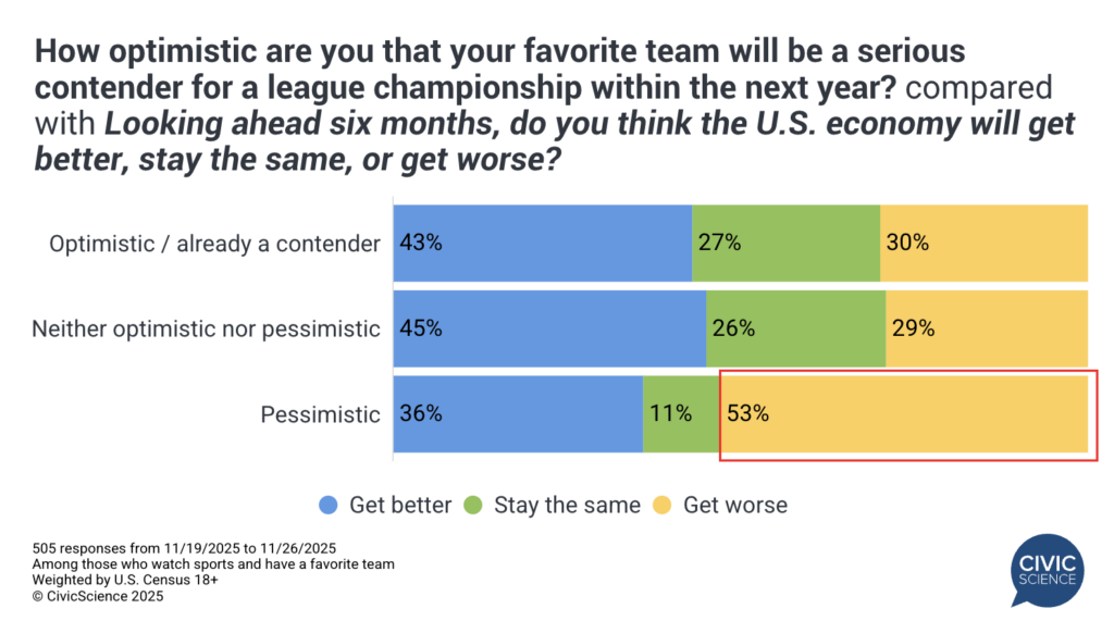 While many factors – notably emotional well-being – shape how people view the economy and their personal finances, CivicScience data show that confidence in one’s favorite sports team is closely tied to economic outlook. Fans who believe their team will be a serious championship contender in the coming year are far more likely than pessimistic fans to say they expect their personal financial situation and the U.S. economy to improve over the next six months. By contrast, 53% of pessimistic sports fans expect the economy to ‘get worse’ over the same period (compared to 30% of optimistic sports fans). Additionally, fans who feel neutral about their favorite team tend to express the highest positive outlook.