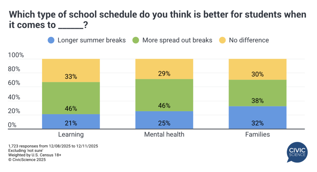 Thirty-eight percent of Americans say more spread-out breaks are better for students’ family lives, compared with 32% who favor traditional schedules. A near majority of Americans also believe that school years with more evenly spaced breaks better support students’ learning and mental health.