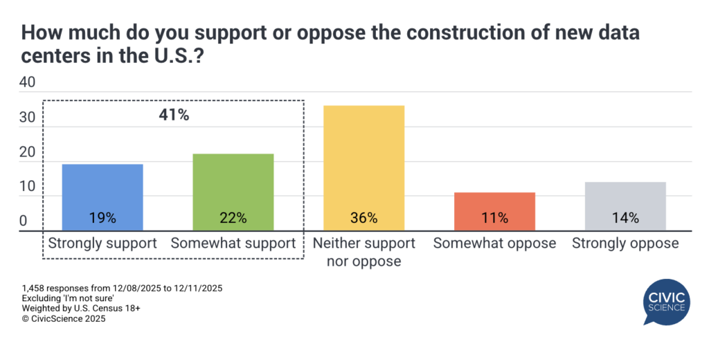 There is substantial support among the American public for the construction of new data centers, despite the mixed sentiments surrounding the topic. According to CivicScience data, 41% of U.S. adults support the construction of new data centers within the country, with support increasing to over 50% among Republicans and Gen Z adults.