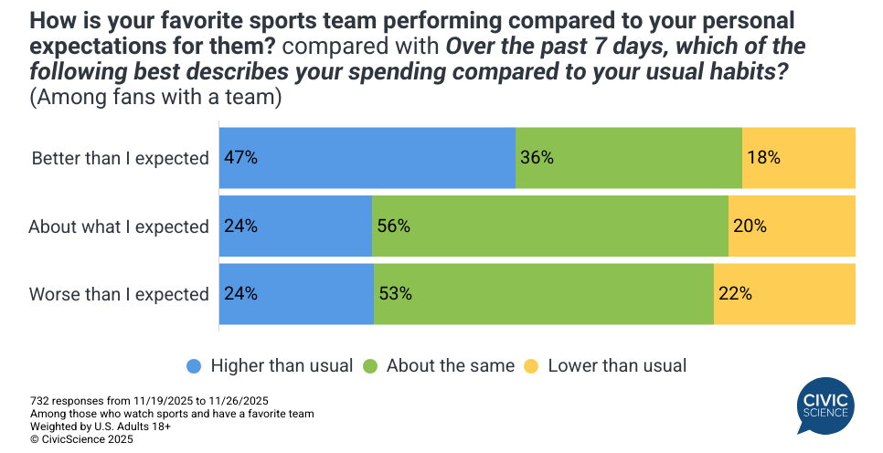While many factors – notably emotional well-being – shape consumer spending, recent CivicScience data show that one’s feelings about their favorite sports team are also closely tied to spending. In fact, fans whose favorite team exceeds their personal expectations are nearly twice as likely to spend more overall recently. Holiday shopping further highlights this divide: 40% of fans who perceive their team is performing well are spending more on the holidays this year compared to last year, nearly doubling the 22% seen among those who believe their team is underperforming.