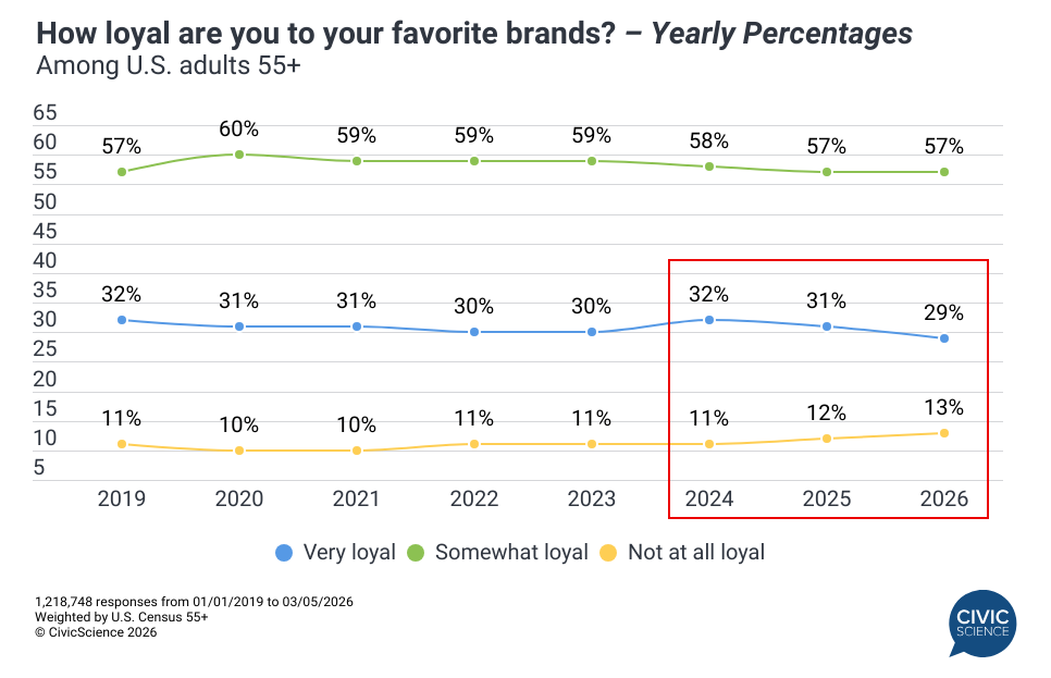 The conventional wisdom has been that Americans in the 55+ demographic are fiercely loyal consumers. Long-term CivicScience data, dating back before the pandemic, supports this notion, with a largely consistent base reporting at least some loyalty to their favorite brands. However, in recent years, that foundation is showing subtle signs of slipping. The percentage of Americans over 55 who say they are ‘not at all’ loyal to their favorite brands is slowly ticking up, standing at 13% as of early March. While this isn’t a drastic or sudden surge, it does mark the highest such percentage since CivicScience began tracking loyalty in 2013.