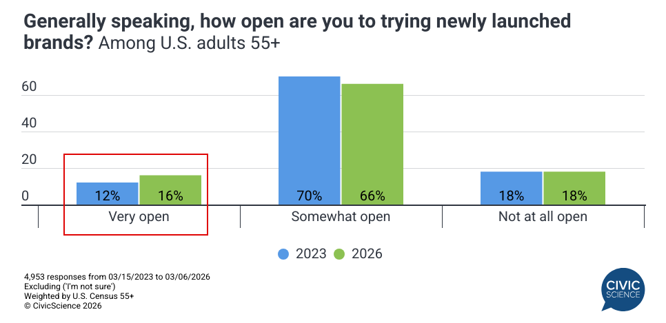 This evolving set of expectations – prioritizing values, quality, and representation – is fueling a broader shift in consumer behavior: older Americans are increasingly open to something new. A strong majority of respondents (excluding those unsure) express at least some receptivity to trying newly launched brands. This openness is intensifying, evidenced by a four-point jump since 2023 in the percentage of those ‘very’ open to new market entrants.
