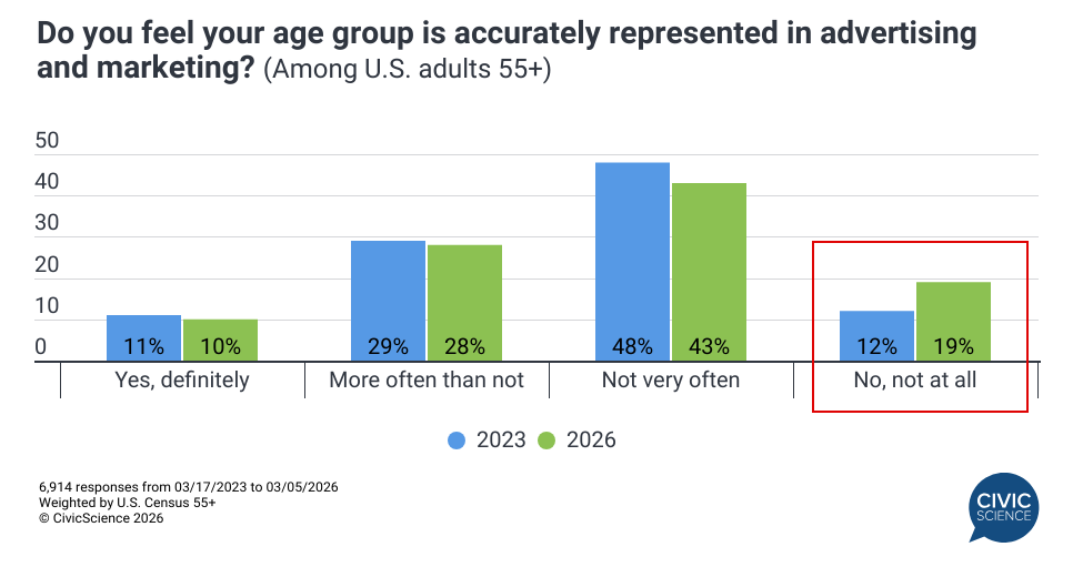Representation appears to be a notable factor in the evolving brand landscape for older Americans. Data reveals a 58% surge since 2023 in the share of the 55+ demographic who feel ‘not at all’ represented in marketing and advertising. This trend is mirrored by a marginal decline in those who feel ‘definitely’ or ‘more often than not’ represented, suggesting that traditional marketing is increasingly out of step with this audience.