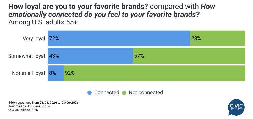 Another element influencing loyalty in the 55+ crowd is the level of emotional rapport they have with their favorite brands. While the demographic is currently divided, with roughly half feeling at least some connection and the other half feeling little to none, the ‘very’ emotionally connected segment remains small at just 9%. Nevertheless, this sentiment is closely tied to brand loyalty, as 72% of the most loyal consumers report some emotional attachment to the brands they buy.