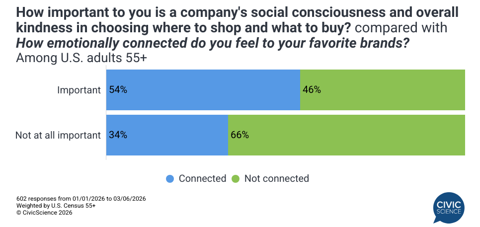 Today’s older consumers are voting with their wallets: 77% will switch to brands that mirror their personal values (up three points from 2024, excluding ‘no opinion’), and 72% weigh a company’s social consciousness and kindness in their purchasing decisions. This isn’t just about ethics; it’s shaping connection. Those who prioritize brand values are 20 points more likely to report a strong emotional connection to the brands they buy.