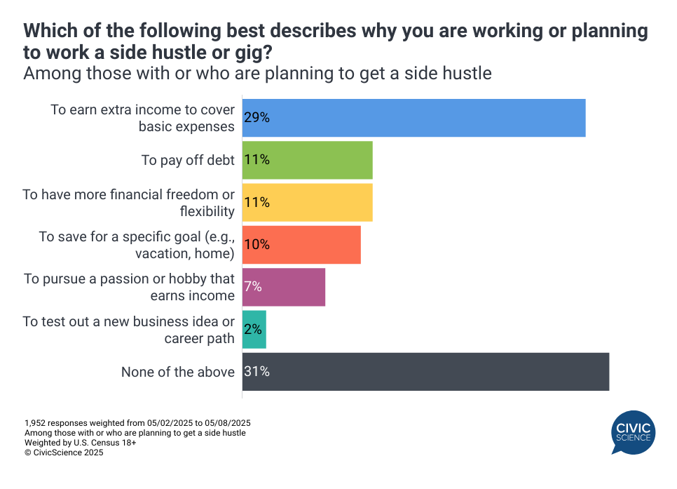 A look at motivations reveals that 29% of those with a side hustle or those planning to get one say they need additional income to afford basic expenses—groceries, utilities, housing, etc. The next most popular reasons for working a side job are ‘to pay off debt’ and ‘to have more financial freedom or flexibility.’