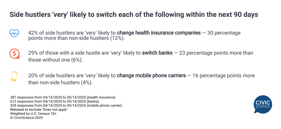 Amid the current economic uncertainty, regardless of how much money is being earned per year, consumers are being strategic about how and when they spend their money. CivicScience data show a correlation between people who side hustle and the likelihood of making changes to recurring monthly spending. Polling data reveal people who work a side gig are more likely to do the following within the next 90 days: