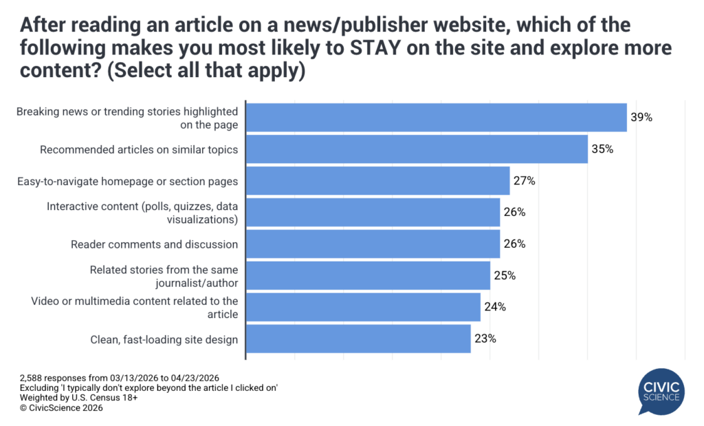 Among those who explore a news/publisher site beyond an initial article, timely and relevant content are the strongest drivers of further engagement. Breaking or trending news articles highlighted on the page rank as the leading factor, cited by 39% of U.S. adults, followed closely by recommended articles on similar topics (35%) – highlighting the importance of surfacing content that aligns with readers’ immediate interests. While these core drivers lead, features like interactive elements such as polls (26%), video (24%), and site experience factors such as ease of navigation (27%) play a secondary but still meaningful role, reinforcing that both content strategy and presentation influence whether users stay on-site.
