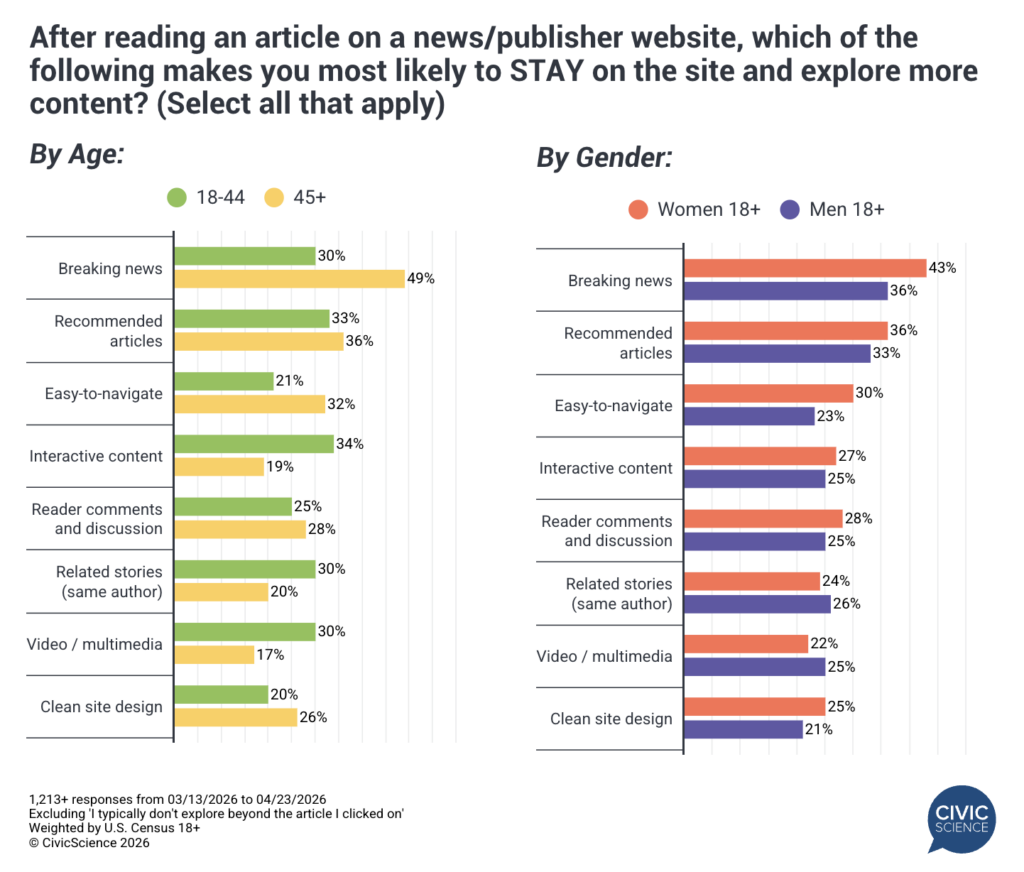Gender differences are more subtle but still notable. Women are more likely than men to cite breaking news (43% vs. 36%) and user experience as factors in continued engagement, including ease of navigation (30% vs. 23%) and a clean, fast-loading design (25% vs. 21%). Men, on the other hand, are slightly more likely to point to video content (25% vs. 22%) and related stories from the same author (26% vs. 24%) as drivers of further clicks.