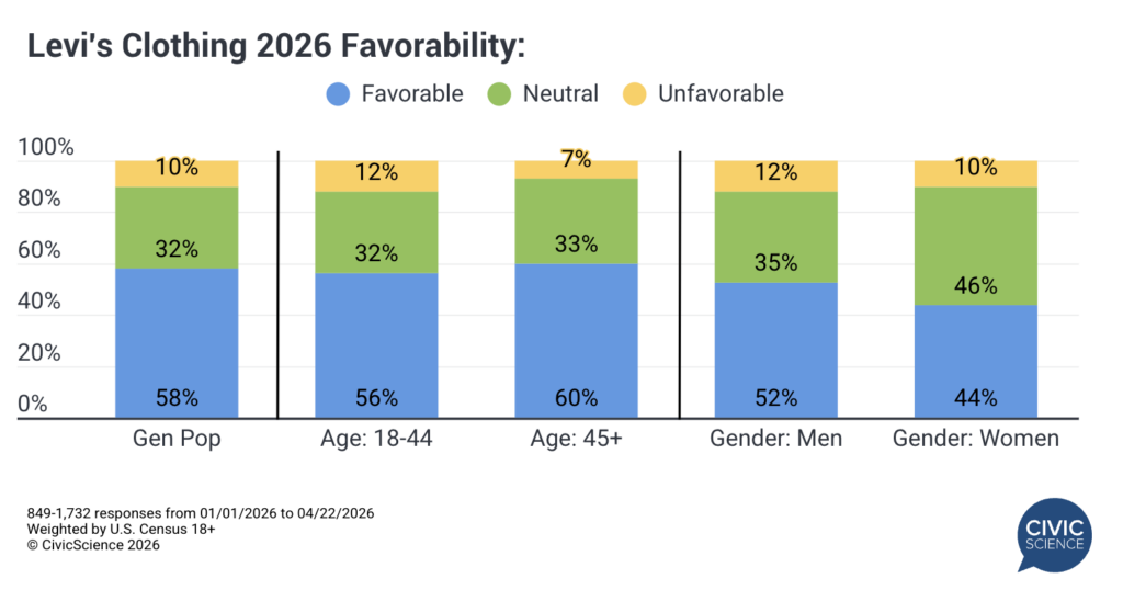 Consumer-declared data from CivicScience underscores this resurgent momentum. Favorability toward Levi’s clothing currently sits at 58%, matching 2025 levels and rising seven percentage points since 2024. While the brand often targets younger consumers, older adults (45+) actually report slightly higher favorability than those ages 18-44. This suggests a powerful opportunity: consumers who grew up with Levi’s may still hold strong, positive associations with the brand – creating strong ground for engagement.