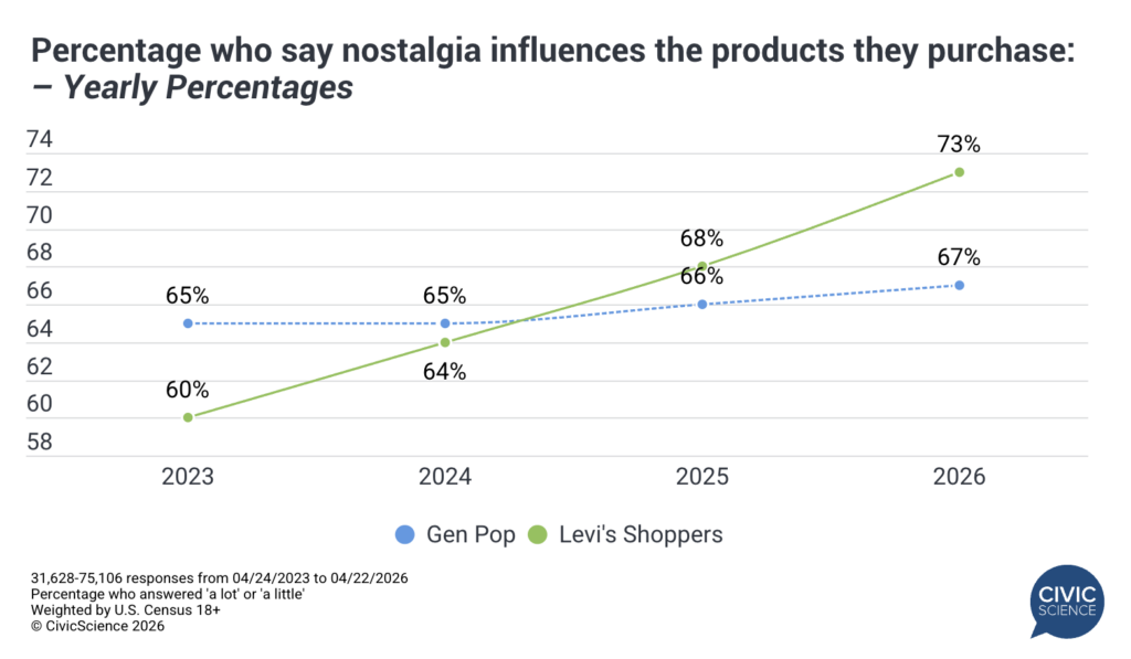 Nostalgia is also playing an increasingly important role. The share of Levi’s customers who say nostalgia influences their purchasing decisions has steadily grown year over year, surpassing the share of the general population. This aligns with the brand’s embrace of vintage-inspired styles and reinforces the emotional connection many consumers have with Levi’s.