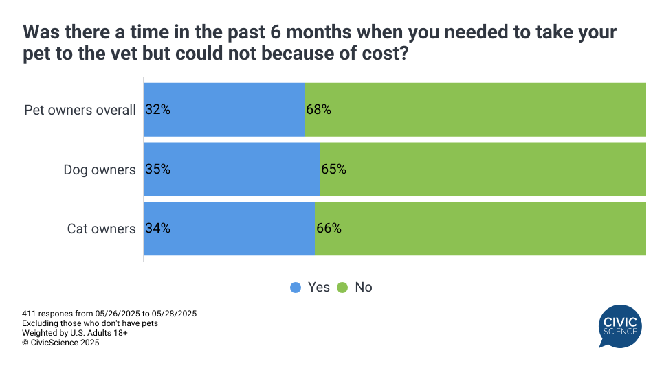 One of the major challenges facing pet owners in this economy is vet care. Thirty-two percent of respondents said that there was a time in the last six months when they couldn’t take their pet to the vet due to prohibitive costs. Dog owners (36%) are slightly more likely to have struggled than cat owners (34%).