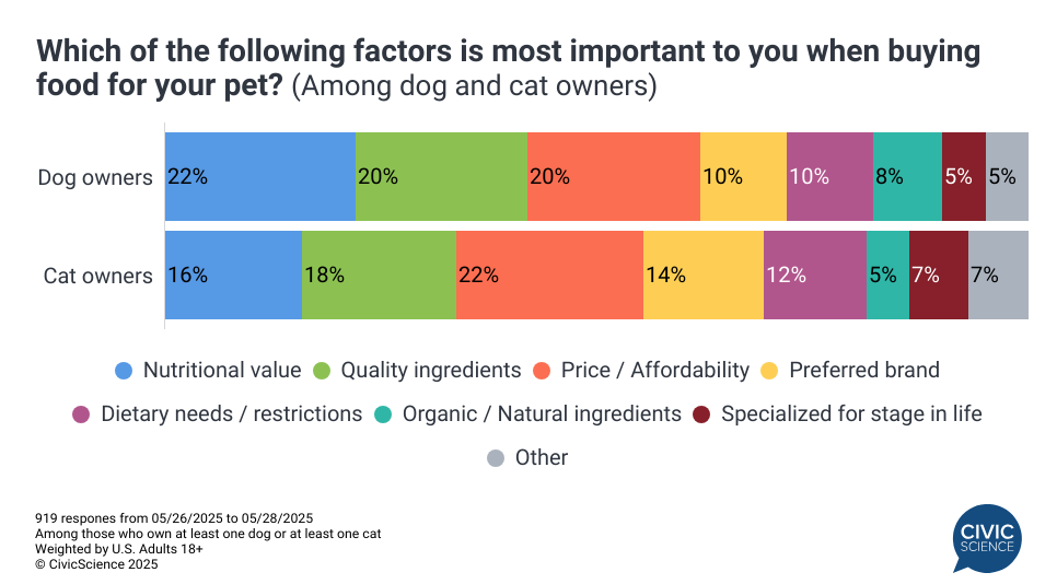 Pet owners also have different priorities when it comes to choosing food to buy for their furry friends. Dog owners are more likely to emphasize ‘nutritional value’ and ‘quality ingredients,’ while cat owners are more likely to cite ‘price/affordability’ and ‘preferred brand.’
