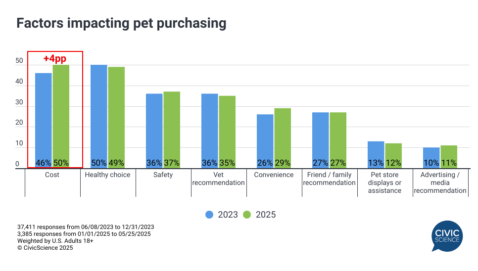 With a sizable percentage of pet owners struggling with vet costs recently in an already uncertain economy, it comes as no surprise that cost is now the number one factor shaping purchases for their pets. ‘Convenience’ has also become a bigger factor since 2023, while ‘healthy choice’ and ‘pet store displays’ have lowered slightly since then.