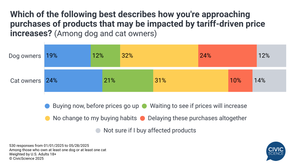 In terms of broader spending overall, just 34% of pet owners say there is ‘no change to their buying habits’ in light of the potential impact of tariffs. Among cat and dog owners, cat owners are more likely to buy now before prices go up or wait to see if prices increase. Meanwhile, dog owners are delaying their purchases altogether.