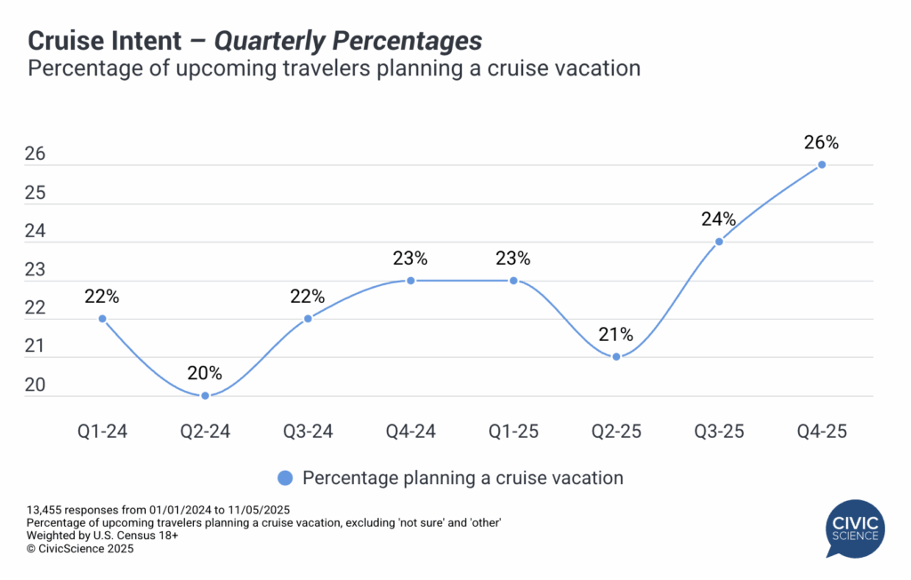 As Thanksgiving and the winter holidays approach, CivicScience data show that cruise vacations are gaining stronger consideration among U.S. travelers. Shifting emotional well-being remains a significant driver of travel planning and may be contributing to the rise in cruise intent. Recent findings indicate that 26% of upcoming travelers plan to take a cruise, marking the highest level of intent YTD. While beach, lake, and outdoor vacations remain the most popular overall, intent for these trip types has either declined or returned to previous levels compared to prior quarters.