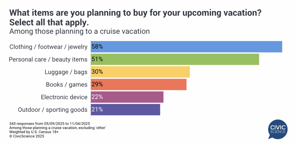 Travel-Related Shopping: Cruise intenders are also active retail consumers preparing for their trips. Nearly 60% plan to purchase clothing, footwear, or jewelry for upcoming travel, and just over half expect to buy personal care or beauty products. About 30% plan to purchase luggage or books, while roughly one in five anticipate outdoor gear or electronics (excluding ‘other’), highlighting strong spending intent among upcoming travelers.