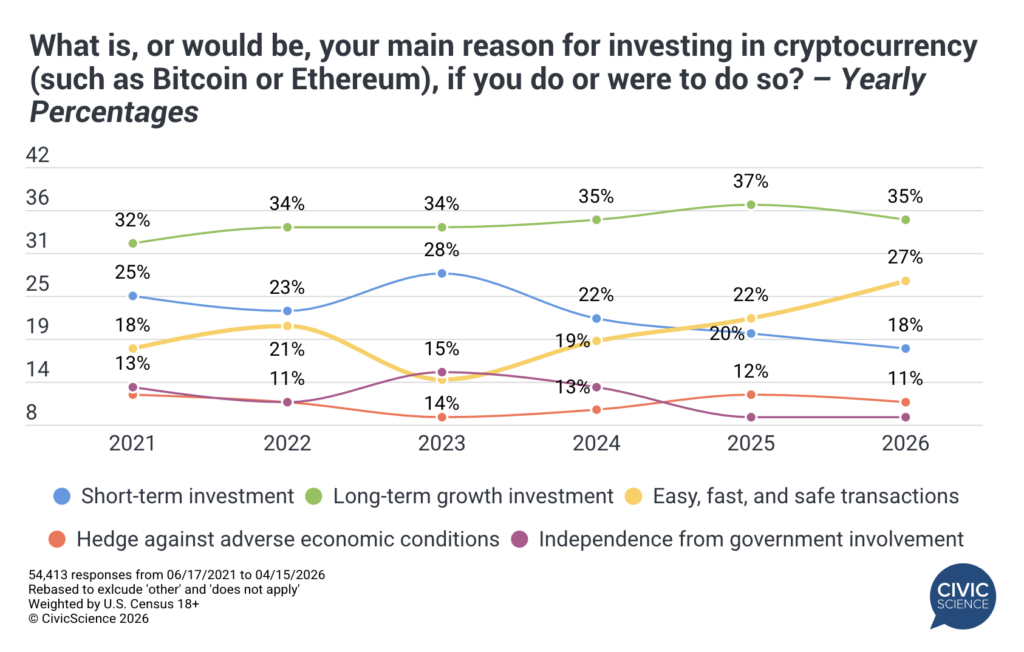 At the same time, interest in short-term investing continues to decline, signaling a potential move away from speculation. Other motivations, such as hedging against adverse economic conditions or seeking independence from government systems, remain steady at around 10%.