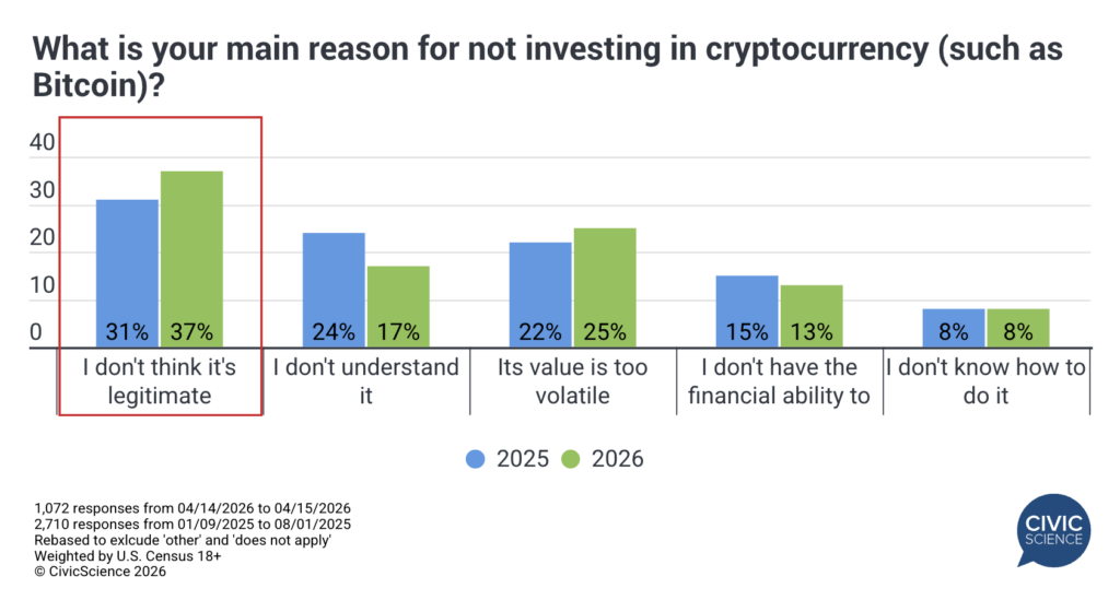 Even as overall trust in crypto remains low, the reasons behind that skepticism are shifting. The share of U.S. adults who say they don’t invest because they don’t believe crypto is legitimate has increased by nearly 20% in the past year alone, cementing its place as the leading barrier and aligning with the broader trust gap. Concerns about volatility rose three points since 2025, now ranking as the second-most cited reason—surpassing those who say they don’t understand it.