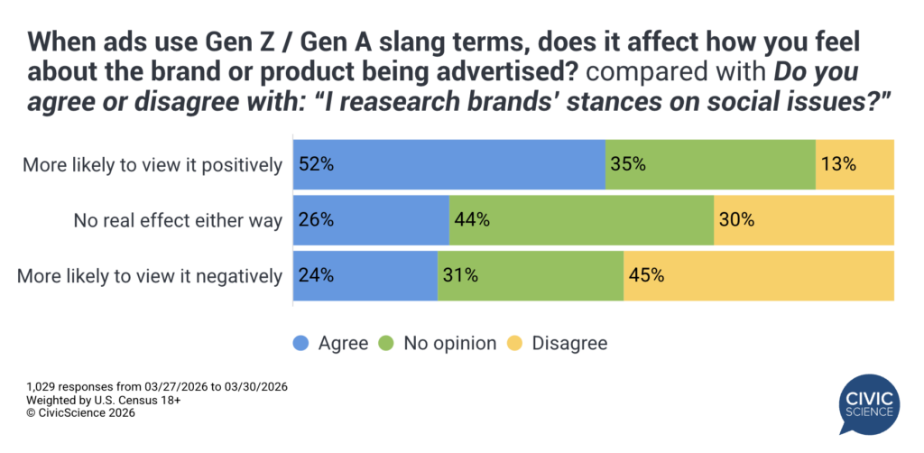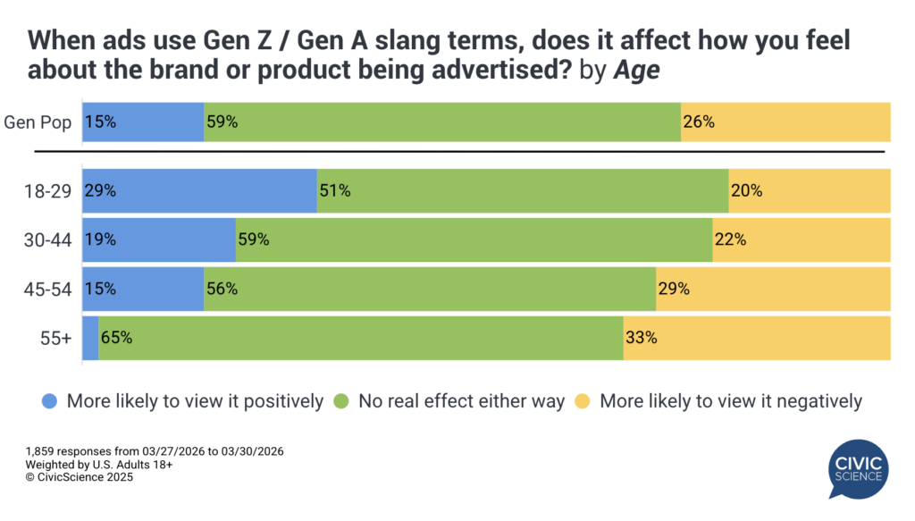 For most consumers, the answer is no. Nearly 60% say Gen Z/Gen A “slang” has no real effect on how they feel about the product or service being advertised. Among those who are swayed, negative reactions (26%) outweigh positive ones (15%), though that gap has narrowed compared to two years ago (34% negative vs. 10% positive).