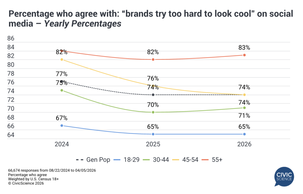 While some brands have successfully struck a balance between staying culturally relevant to Gen Z and differentiating themselves from others jumping on the same trends, most Americans remain skeptical. Nearly three-quarters of U.S. adults (74%) agree that brands try too hard to act cool on social media.