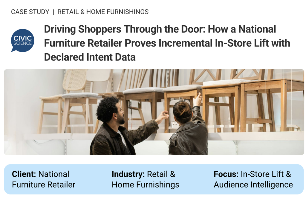 The retailer partnered with CivicScience to run a sustained, multi-quarter advertising campaign powered by CivicScience’s zero-party declared intent data. Rather than reaching audiences based on past behavior, CivicScience identified and activated consumers actively signaling purchase intent and in-market readiness — reaching the right shoppers at the right moment.