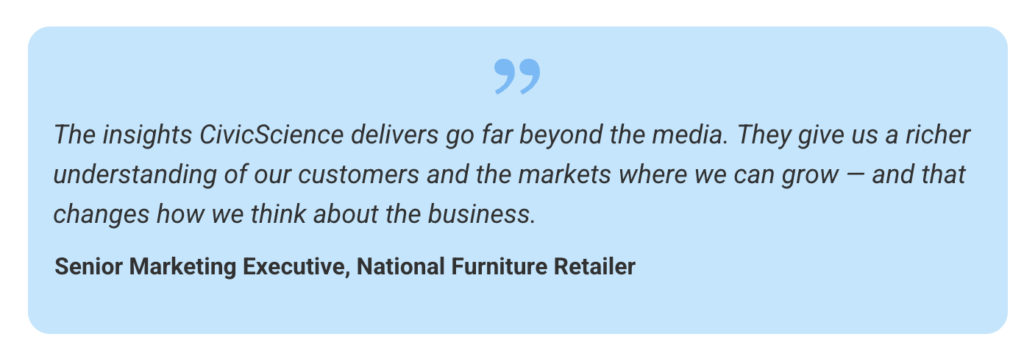 In addition to campaign performance reporting, CivicScience delivered regular audience insights — surfacing attitudinal and behavioral signals about the retailer’s customers that went well beyond what media metrics alone could reveal.