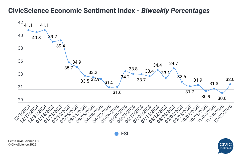 The latest biweekly reading of the Penta-CivicScience Economic Sentiment Index (ESI) rose by 1.4 points, from 30.6 to 32.0, ahead of the December meeting of the Federal Open Markets Committee (FOMC).