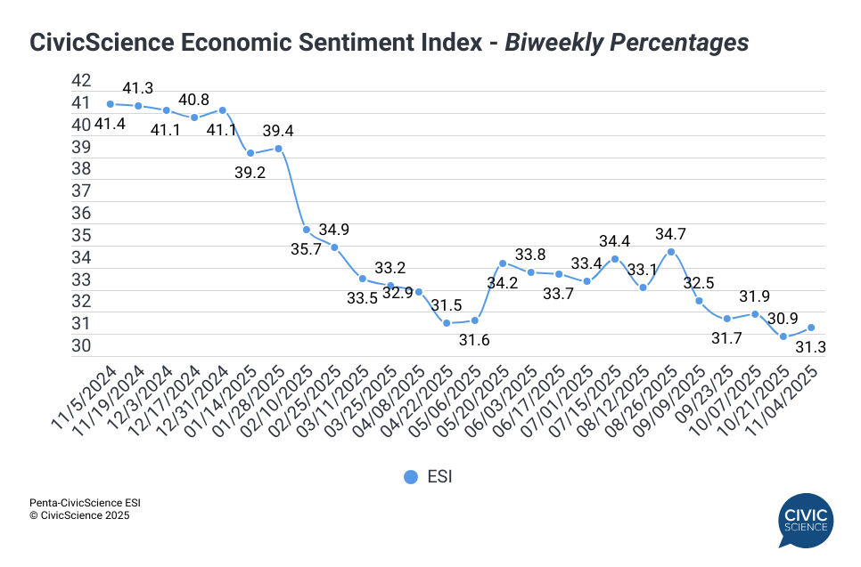The latest biweekly reading of the Penta-CivicScience Economic Sentiment Index (ESI) increased by 0.4 points to 31.3, remaining near an all-time-low as the government shutdown continues.